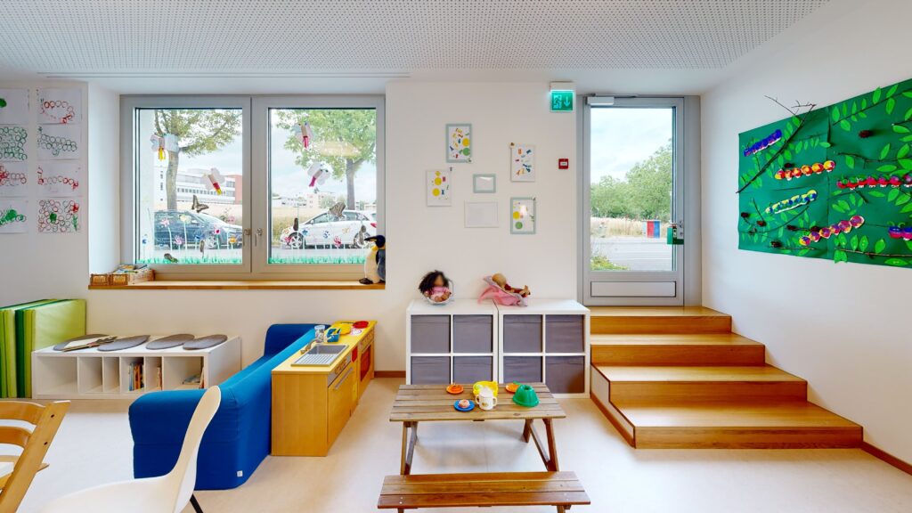 Die Kita-Räumlichkeiten sind nicht nur modern gestaltet, sondern gezielt auf die Bedürfnisse der Kinder ausgerichtet. Eine freundliche Atmosphäre mit hellen, gemütlichen Räumen und kindgerechter Gestaltung sorgt dafür, dass sich die Kinder rundum wohlfühlen. Der Kita-Garten mit Sandbereich und Wasserspiel sowie der angrenzende Park bieten das ganze Jahr hindurch zahlreiche Möglichkeiten für Spiel, Entdeckung und Abenteuer. Darüber hinaus betreuen wir auch Schulkinder während der Randzeiten und unterstützen sie bei den Hausaufgaben.