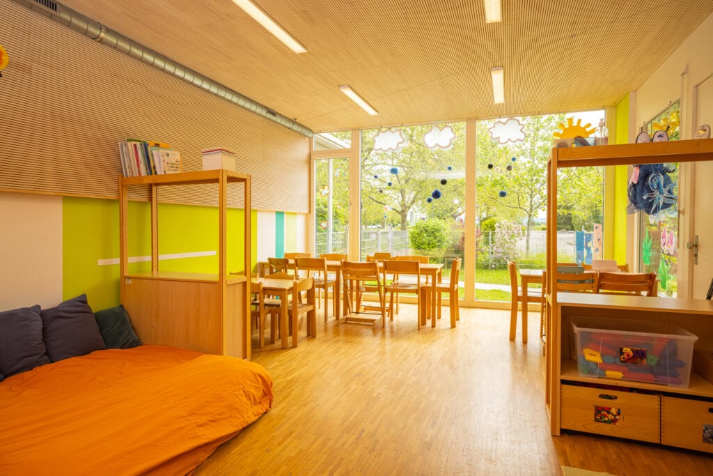 Das Gebäude der Kita Zauberstei wurde speziell für die Kita errichtet. Die Zimmer sind durch die grossen Fensterfronten sehr hell und barrierefrei, was auch unseren Kleinsten ein aktives Teilnehmen am Alltag ermöglicht.